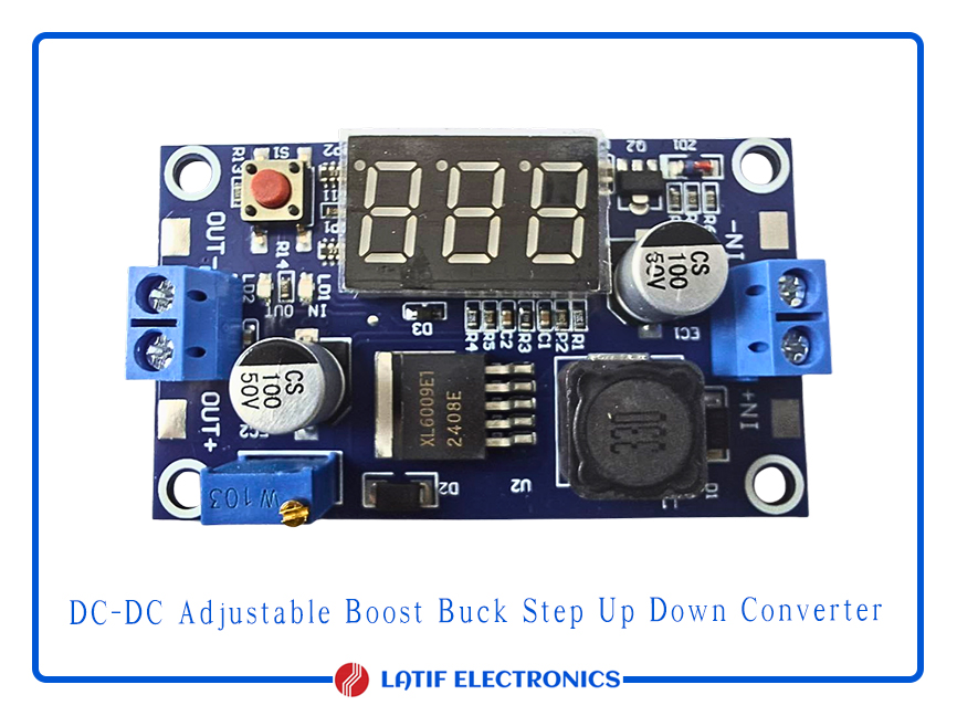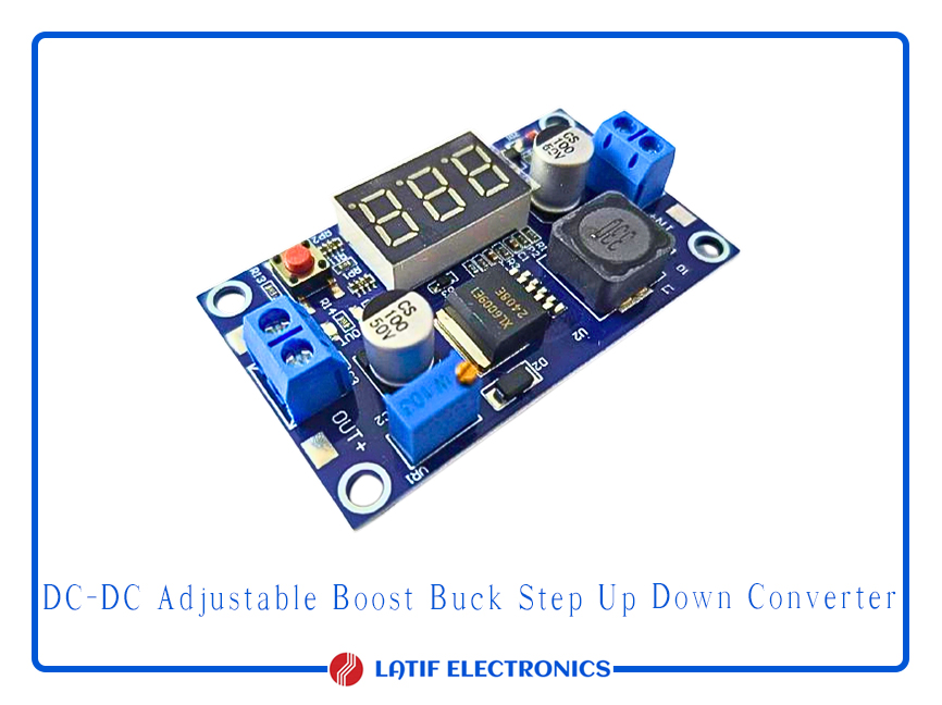 Step up dc converter : محول يعمل بتيار مستمر عادتا ما يستخدم لرفع الفولتية بمفدار يمكن تحديده من خلال مفتاح ضغط مع شاشة تبين مقدار الفلوتية الناتجة.
