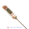 Compact digital thermometer with LCD display and 20cm extended stainless steel temperature probe for easy access to test materials. Temperature range from -50 to 300°C. The thermometer is battery operated, AG13 type, has a digital display that shows the temperature in Celsius and Fahrenheit
