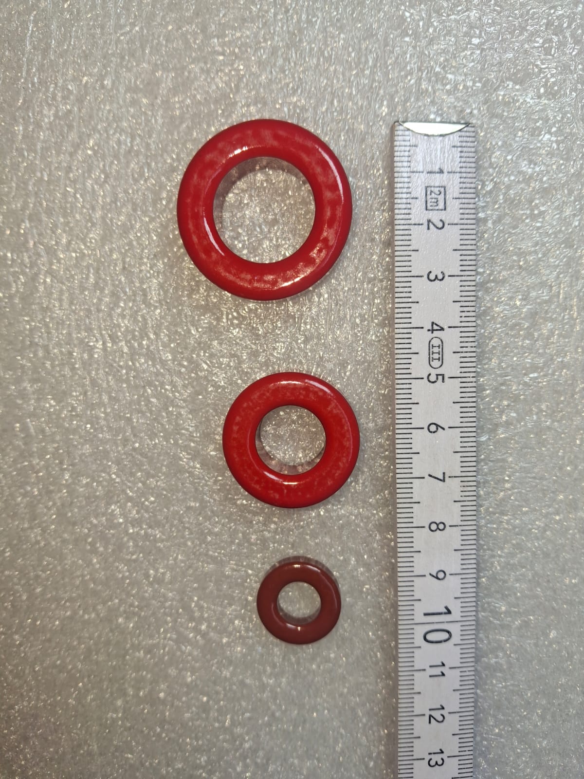 The specifications of the core depend on the dimensions of the ring, which plays a crucial role in determining the power that will be converted through it, as well as the core’s components. The core is typically made of ferrite (iron oxide) with other additives such as zinc, magnesium, aluminum, and others. These additives alter the magnetization properties according to the frequency range of the electric current passing through it. These specifications can be distinguished by the final color of the ring material. For example, red is suitable for frequencies from 1 kHz to 300 kHz for optimal power conversion. Yellow, orange, green, gray, and black are used for other frequency ranges.